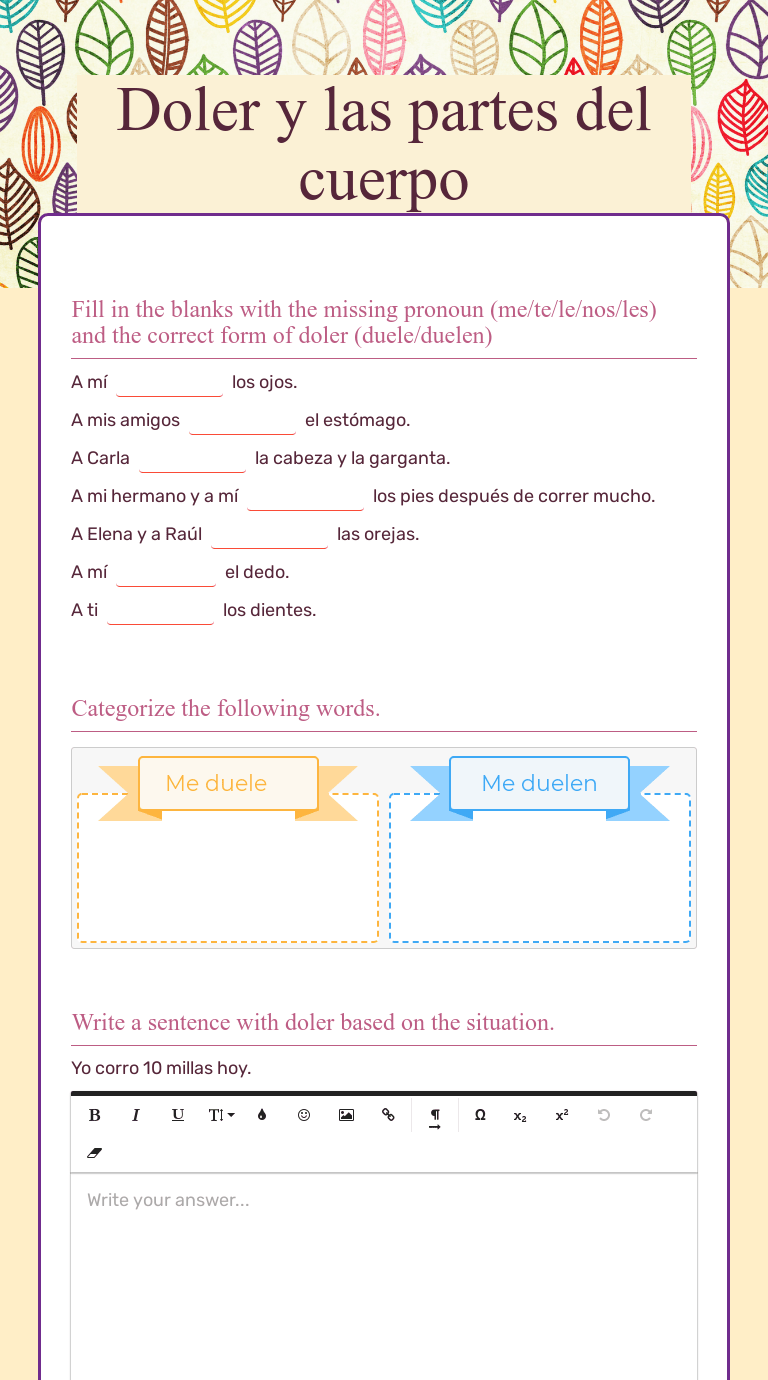 Parts of the body with our free online activities, games and worksheets. Las partes del cuerpo worksheet. Las partes del cuerpo parts of the body nombre: This online quiz is called las partes del cuerpo spanish, espanol, cuerpo, body parts, ejjaidali. Aprende la canción de "las partes del cuerpo".
